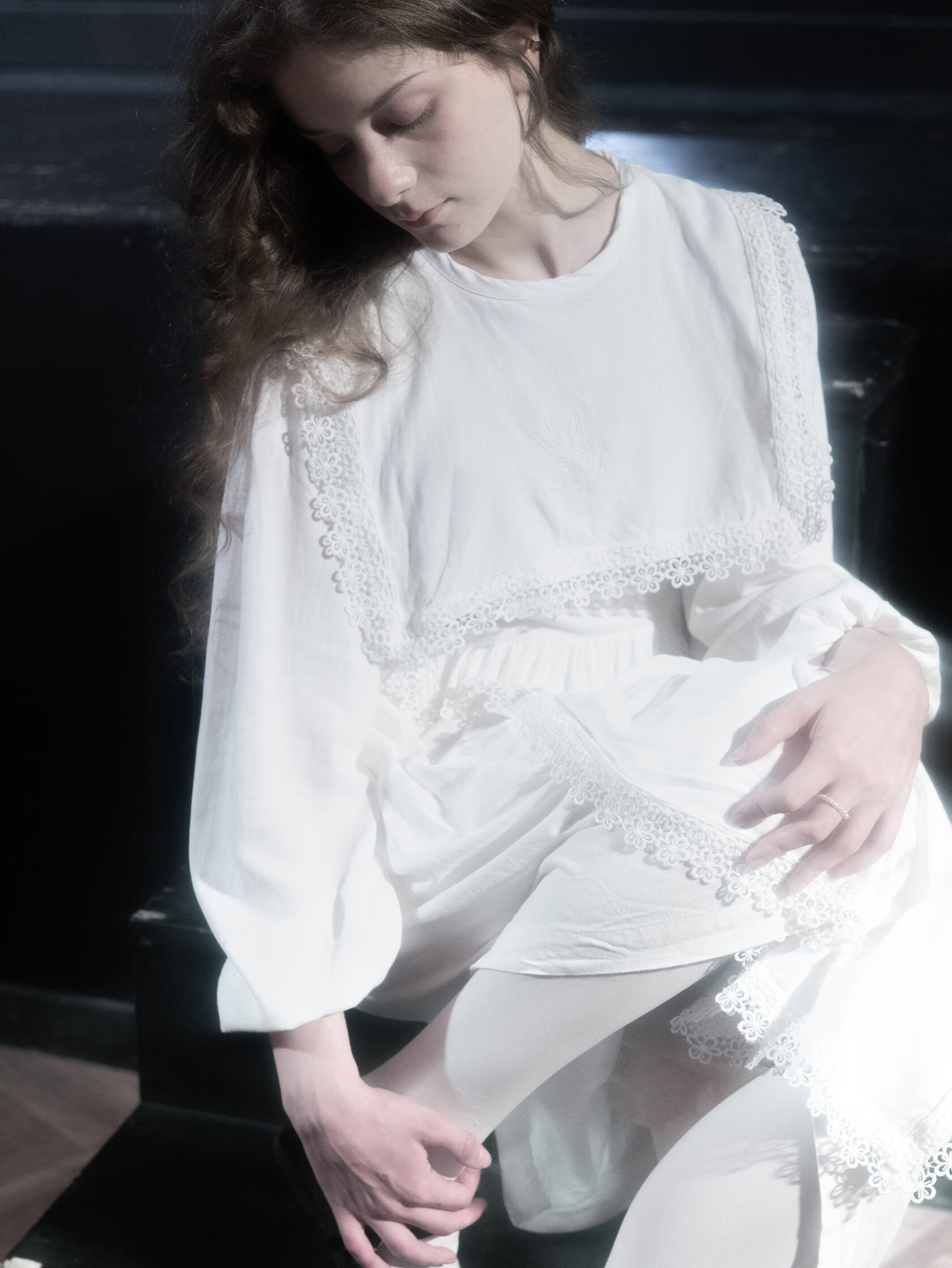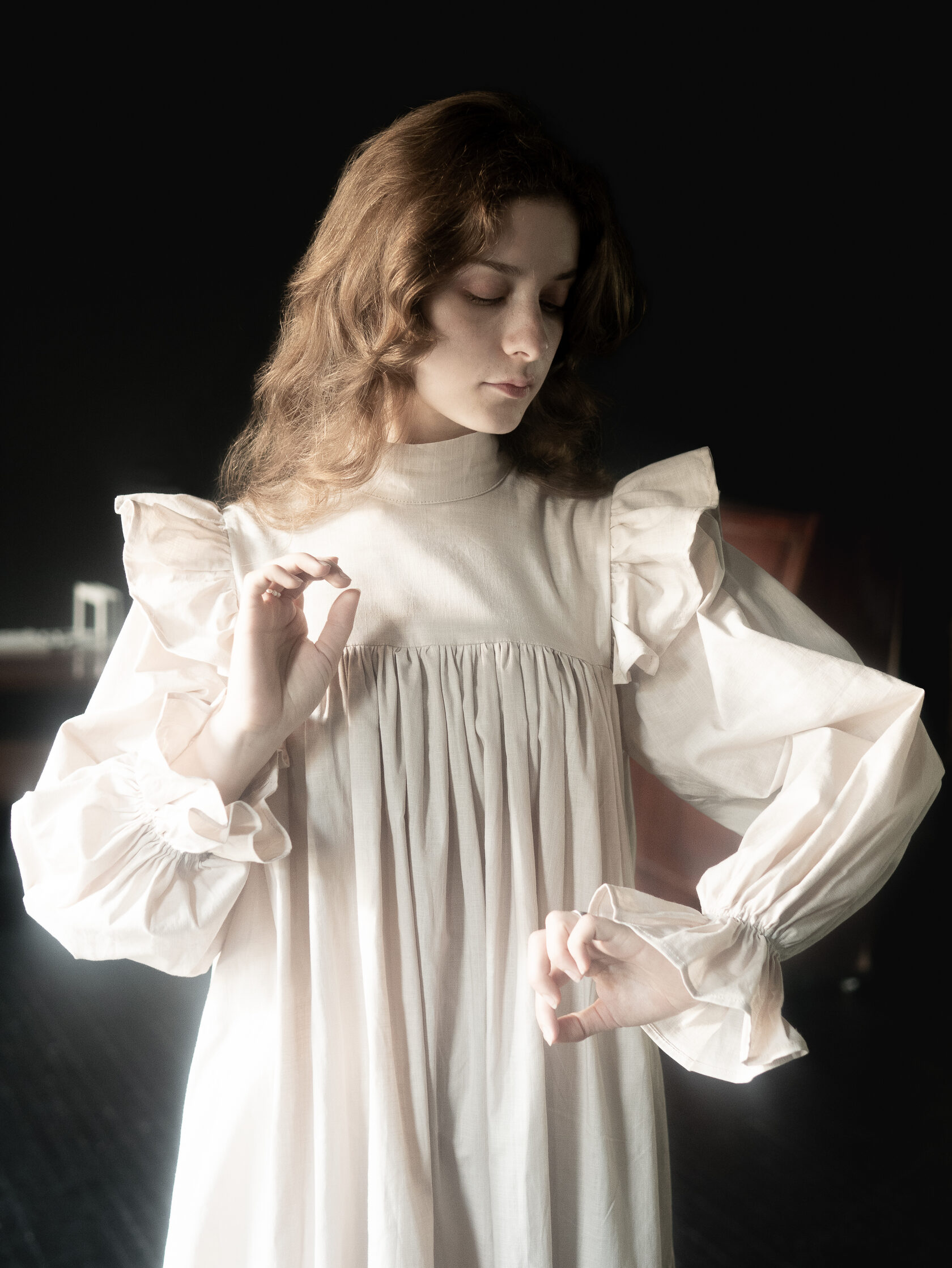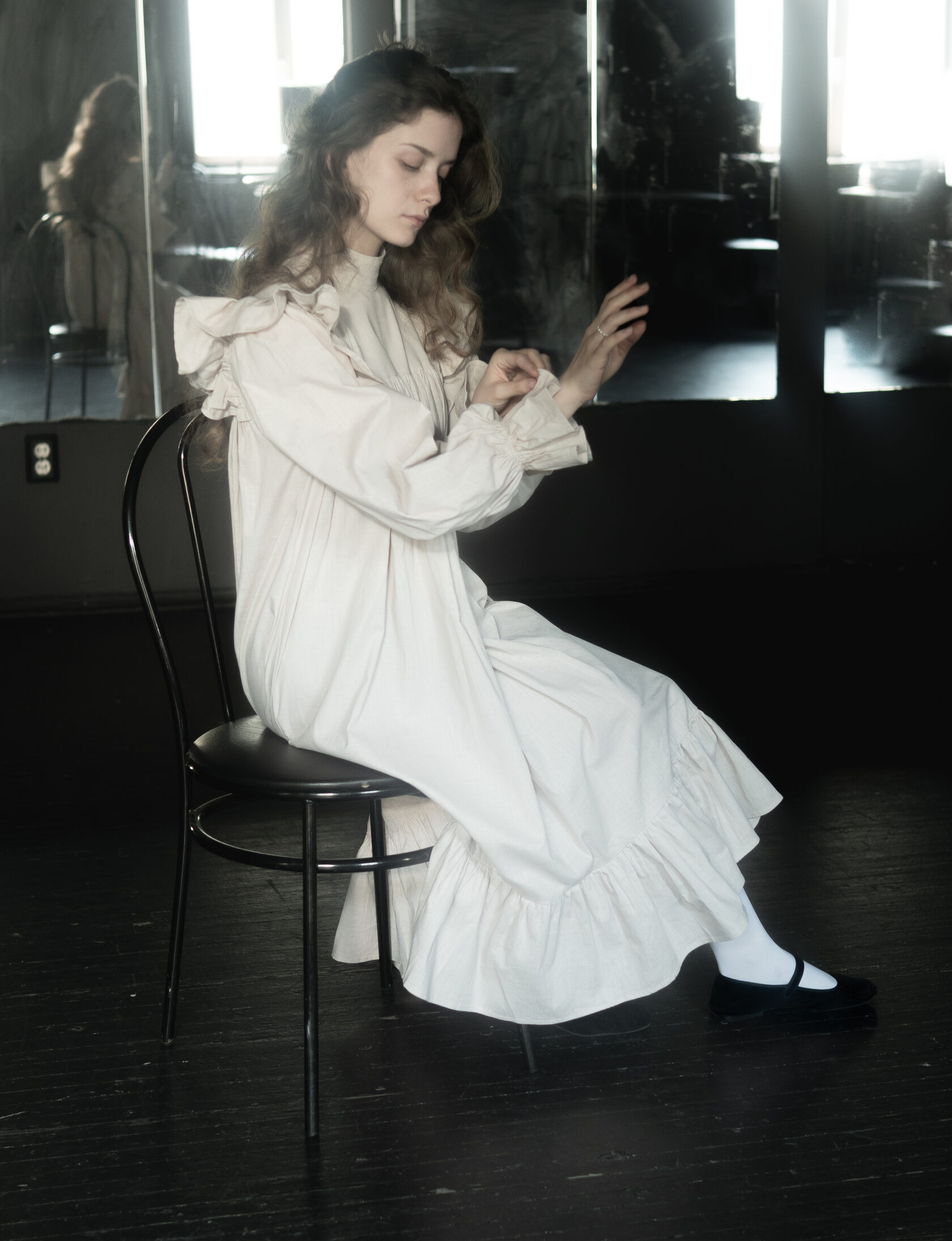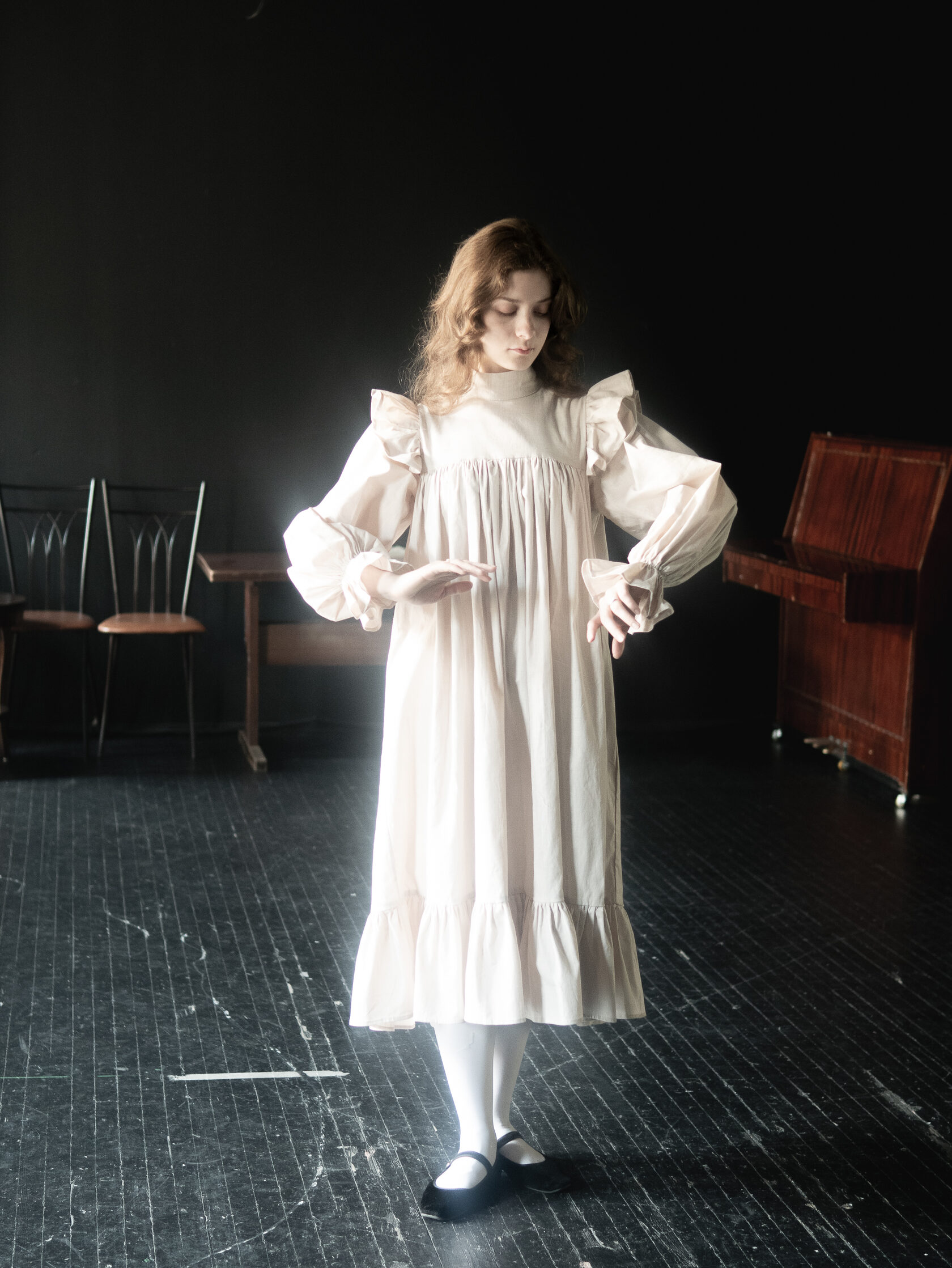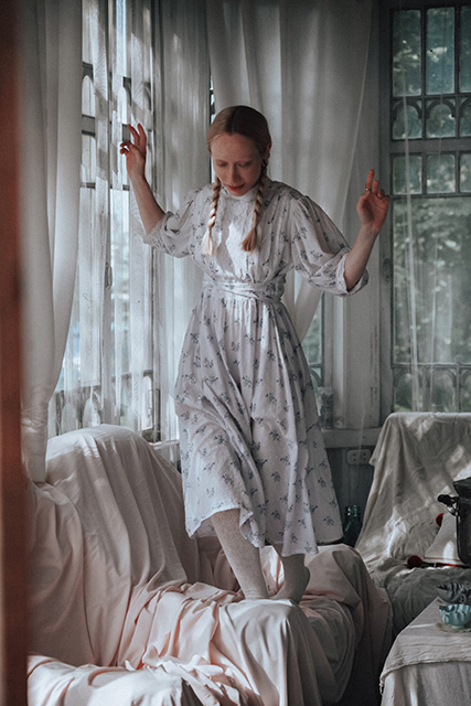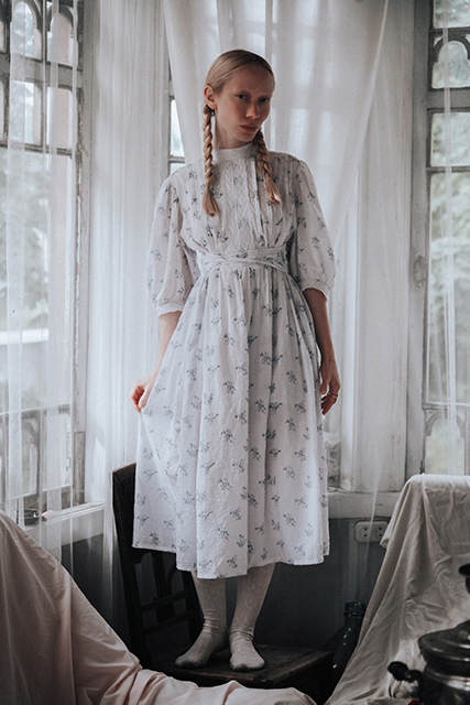 Белое платье с вышивкой голубя из мягкого вискозного льна. Отделка передника и воротника узорным кружевом из гипюра — отсылка к деревянным резным наличникам, фарфоровой посуде, перьям на крыльях лебедя, напоминание о молоке в прозрачном стакане, облаках в небе, земле, покрытой снегом