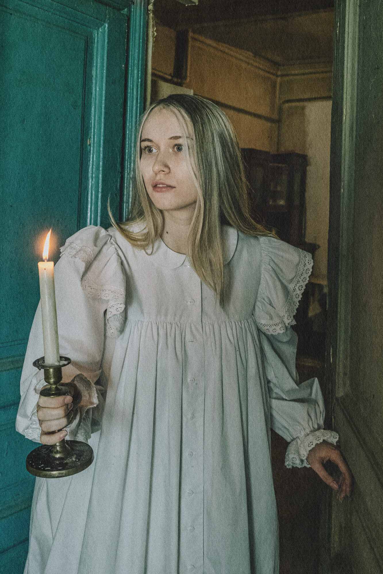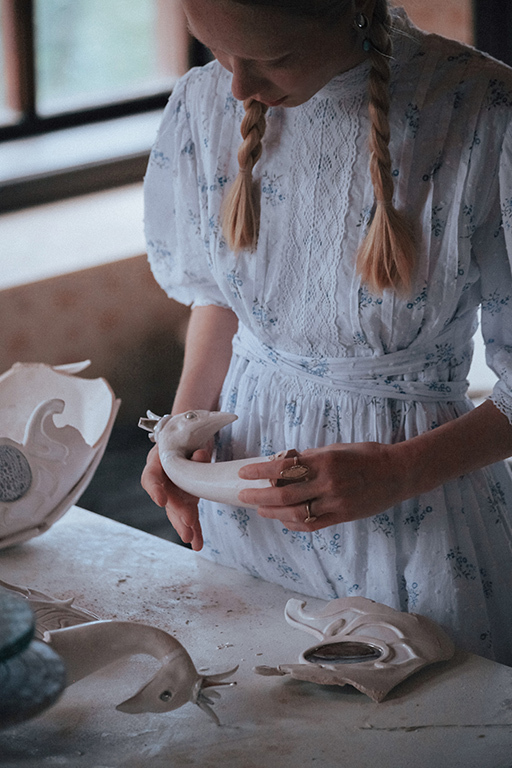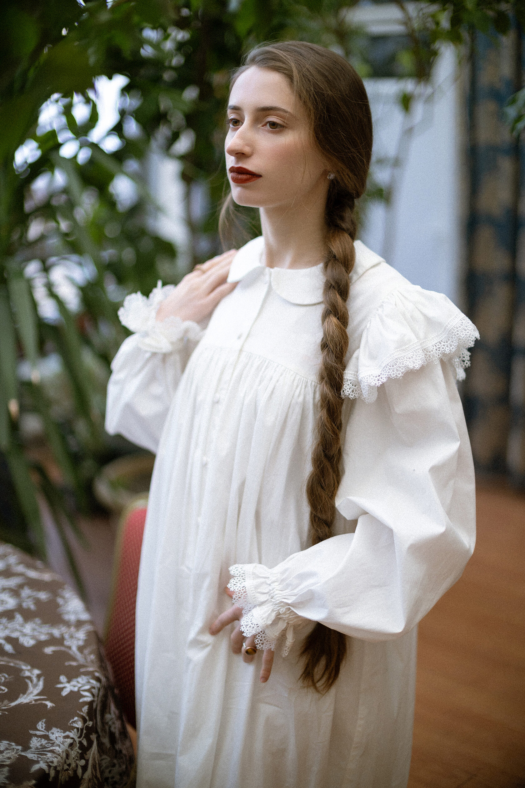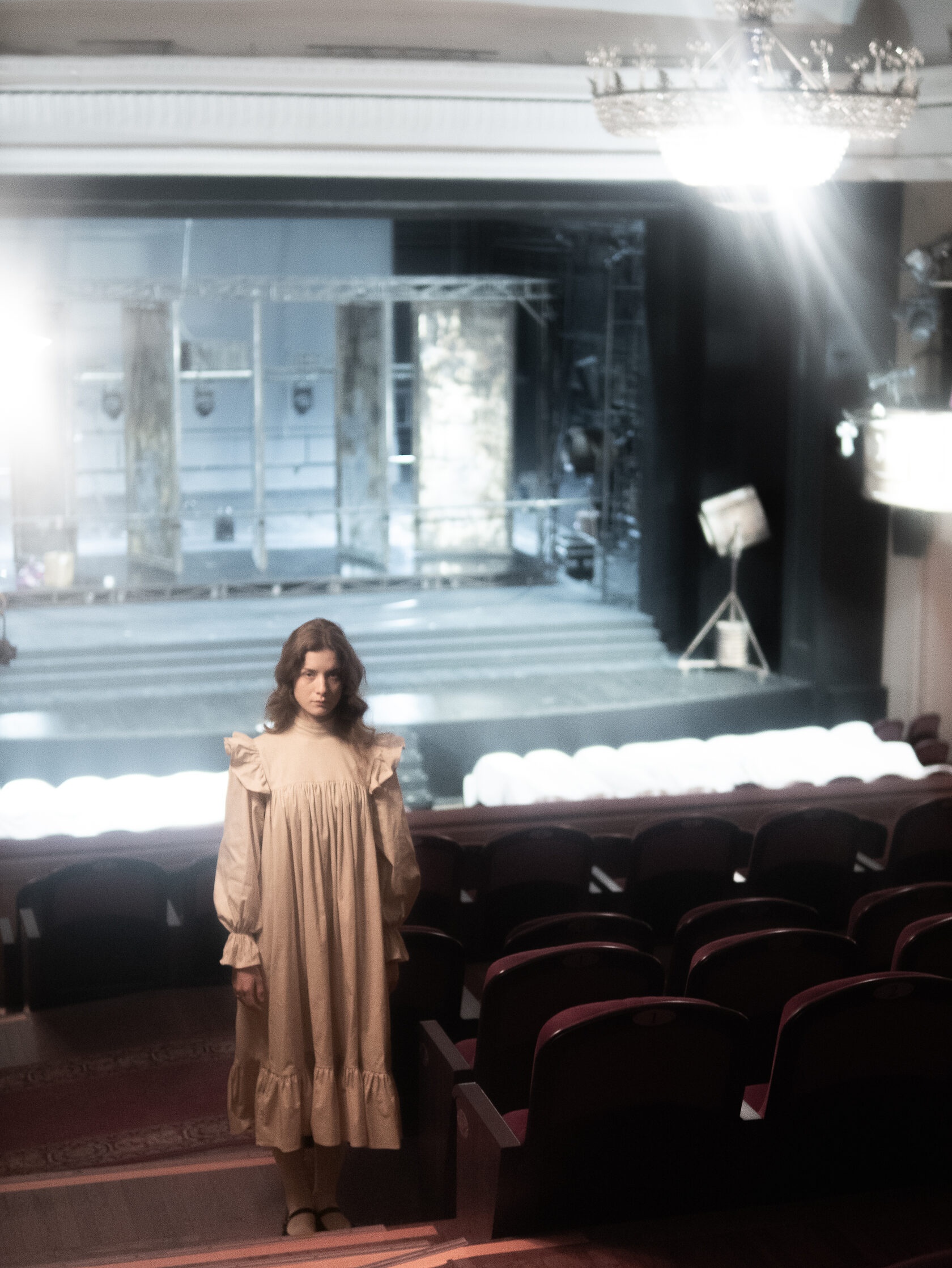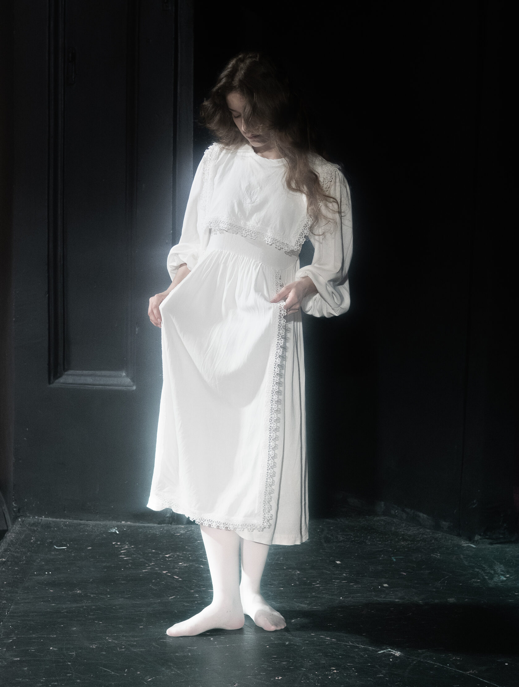 Белое платье с вышивкой голубя из мягкого вискозного льна. Отделка передника и воротника узорным кружевом из гипюра — отсылка к деревянным резным наличникам, фарфоровой посуде, перьям на крыльях лебедя, напоминание о молоке в прозрачном стакане, облаках в небе, земле, покрытой снегом