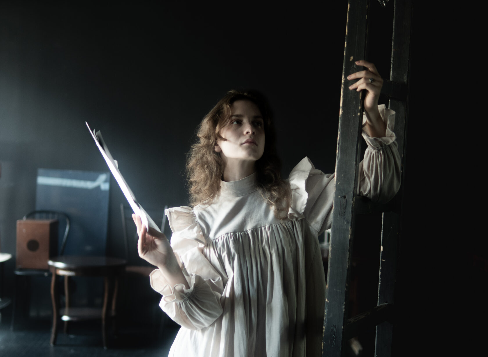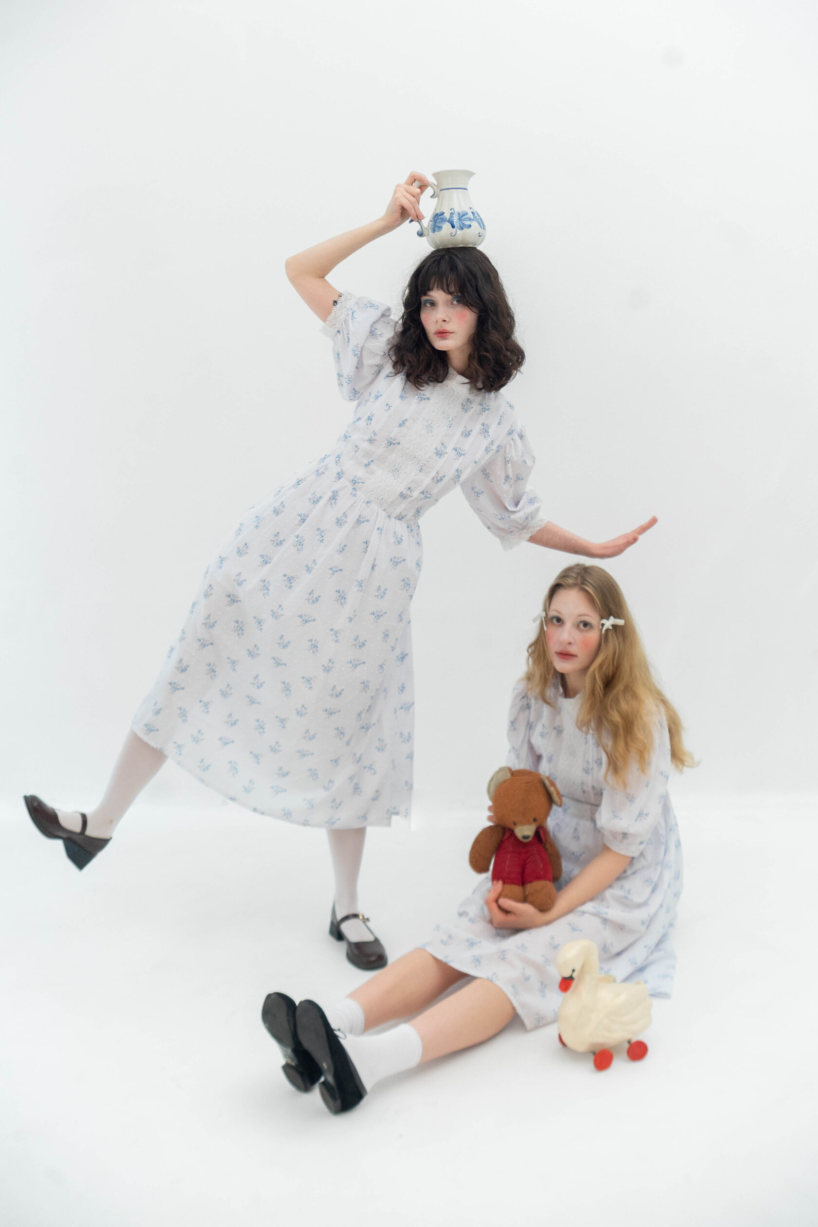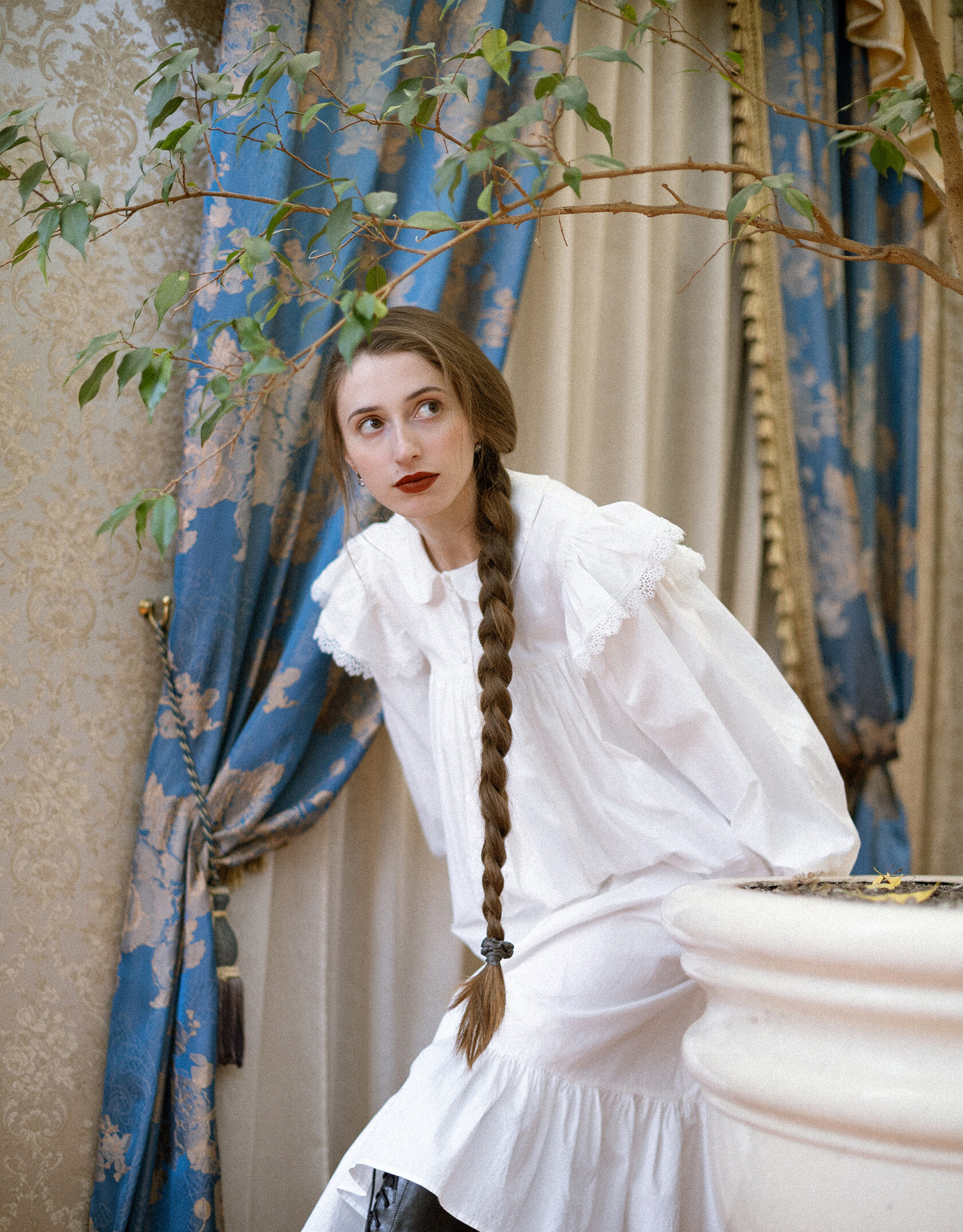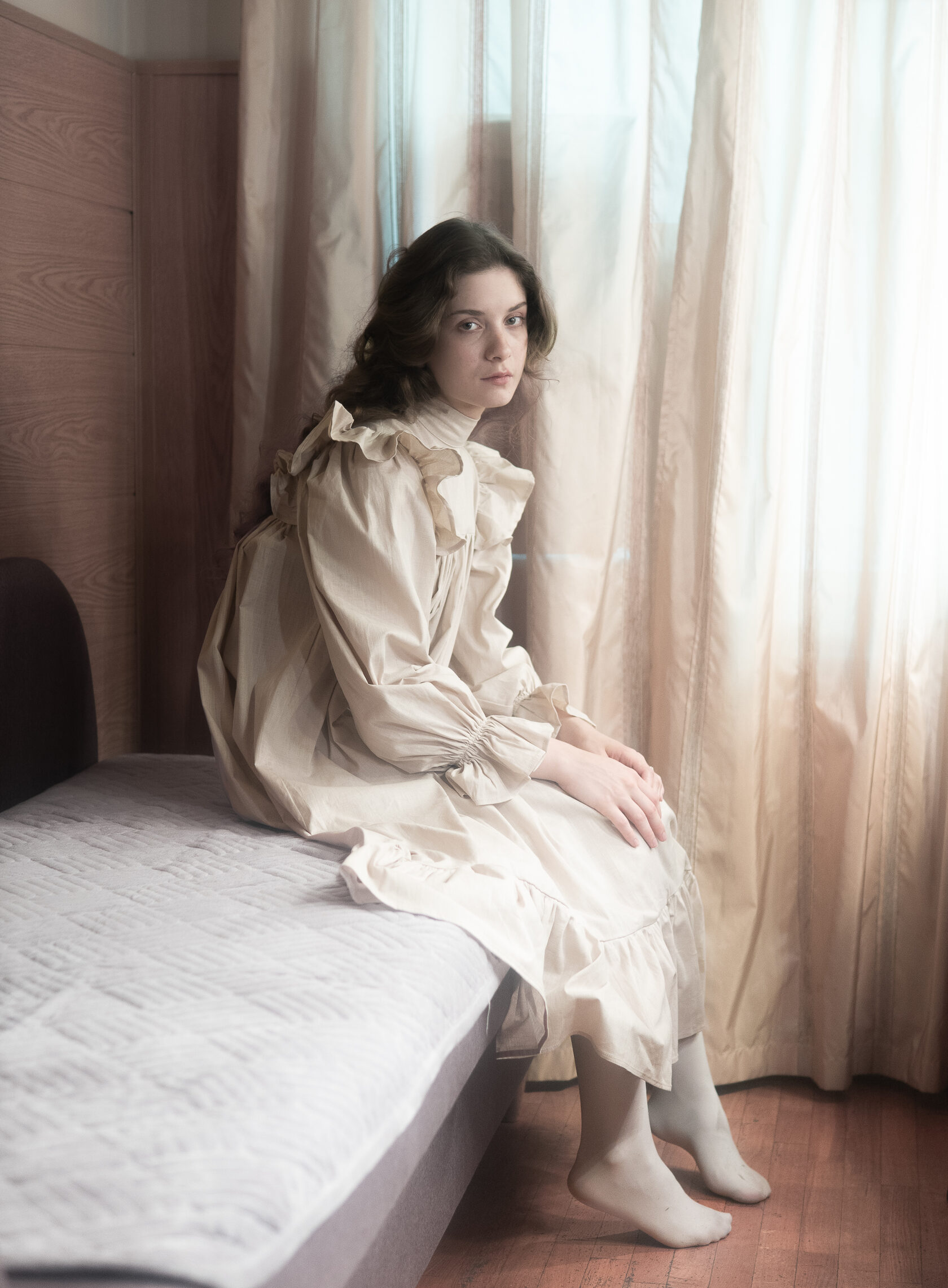 Белое платье с вышивкой голубя из мягкого вискозного льна. Отделка передника и воротника узорным кружевом из гипюра — отсылка к деревянным резным наличникам, фарфоровой посуде, перьям на крыльях лебедя, напоминание о молоке в прозрачном стакане, облаках в небе, земле, покрытой снегом