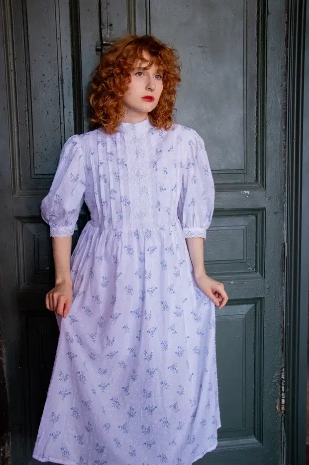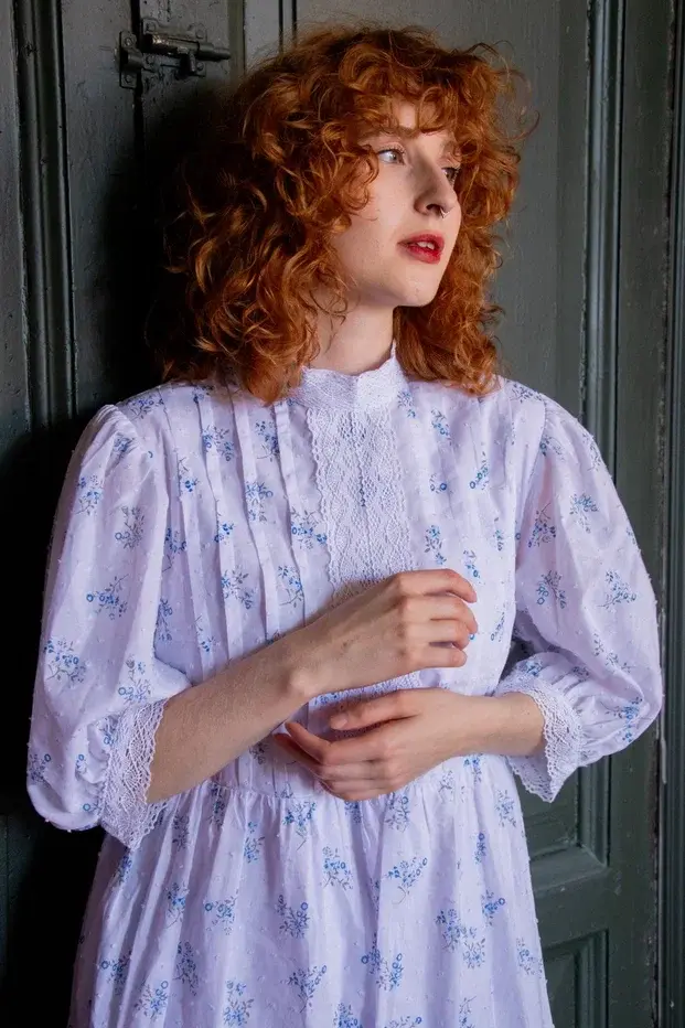Нежное весеннее платье из хлопка в мушку с цветочным принтом. Украшено хлопковым кружевом. Представлено в двух размерах XS-S и М. На рост выше 165 см лучше выбрать размер М
